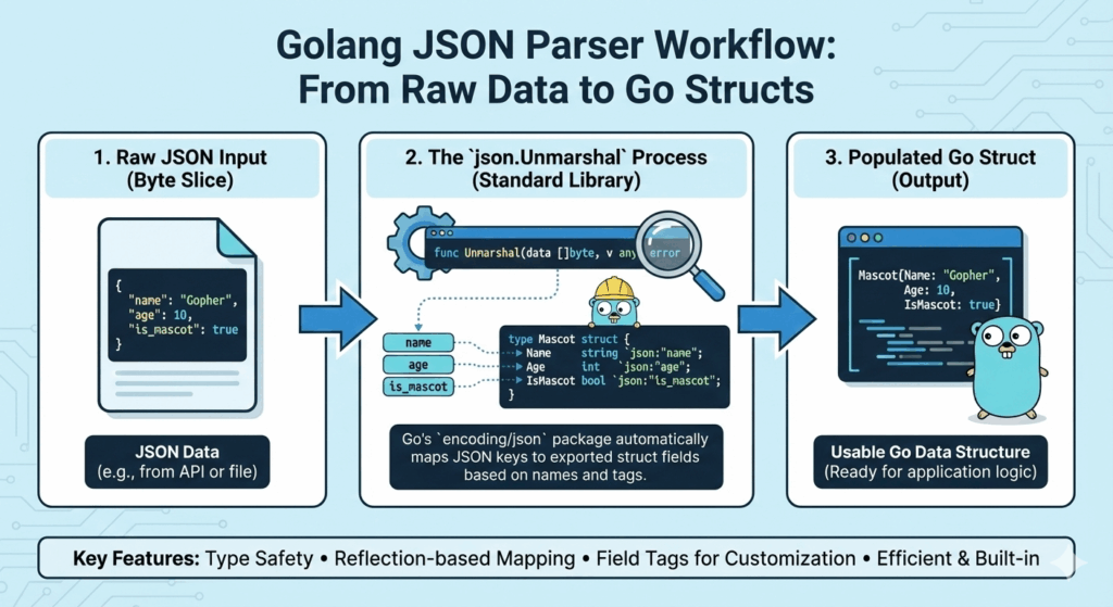 The infographic titled “Golang JSON Parser Workflow: From Raw Data to Go Structs” illustrates how the Go programming language handles the conversion of JSON data into native data structures.